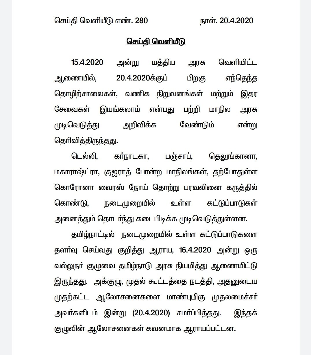 ஆனால், ஒரு சில நிறுவனங்கள், தொழிற்சாலைகள் ஏப்ரல் 20ம் ஆம் தேதிக்குப் பிறகு ஒரு சில கட்டுப்பாட்டுகள் விதித்து இயங்க மத்திய அரசு அனுமதி அளித்திருந்தது.