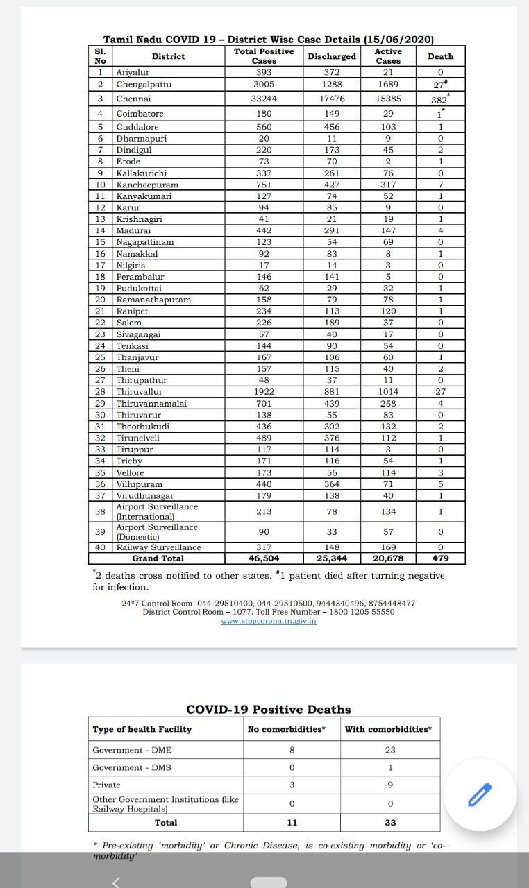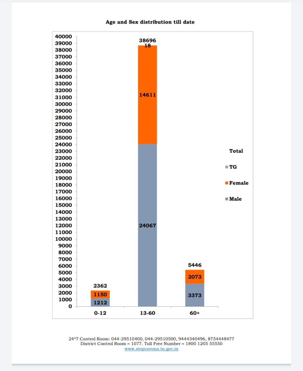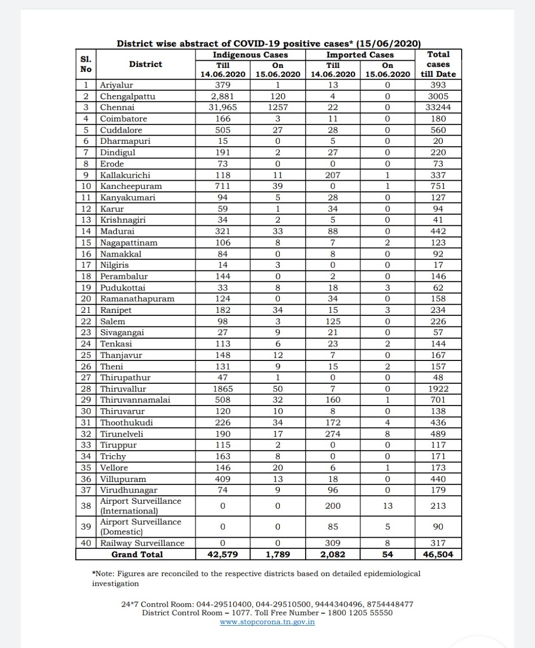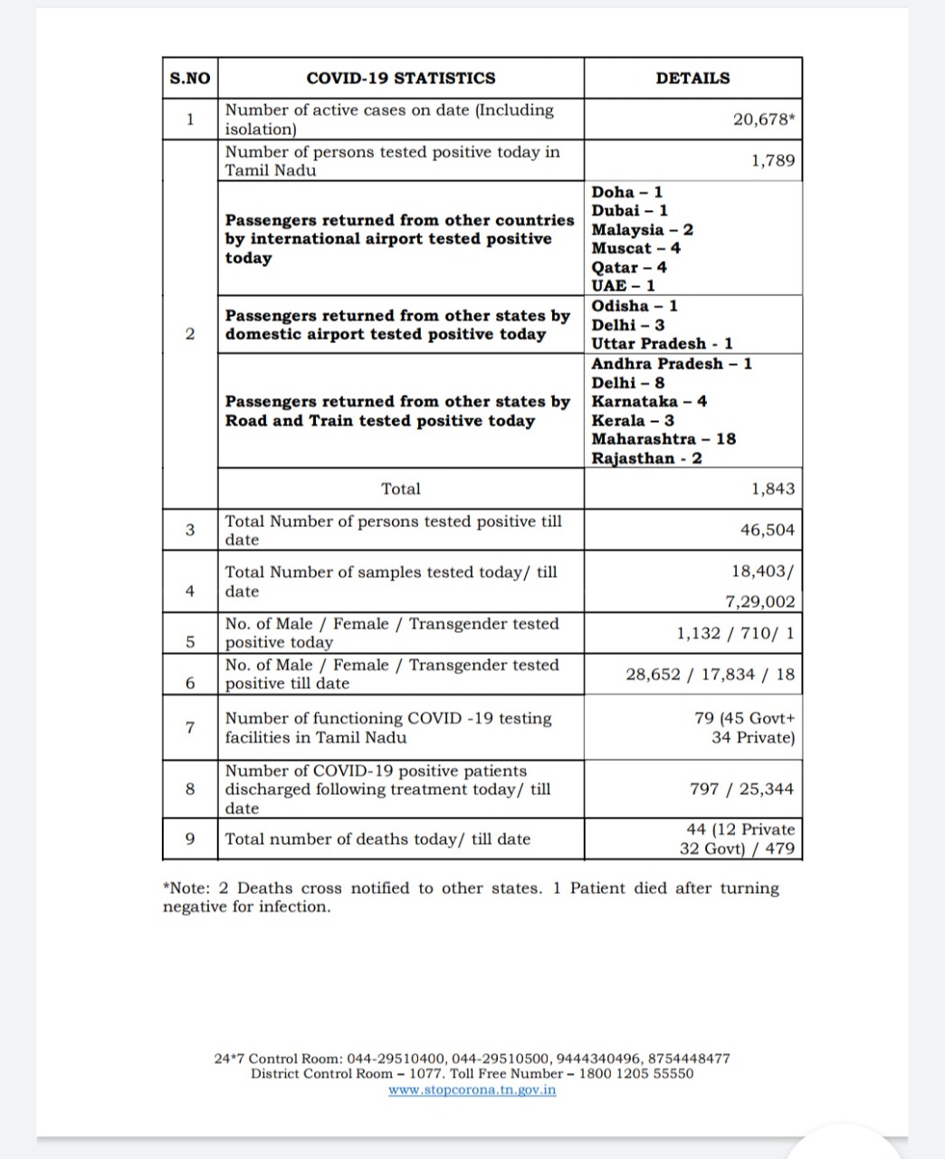 தமிழகத்தில் இன்று 1843 தொற்றாளர்கள் கண்டறியப்பட்டுள்ளனர். அதில், சென்னையில் 1257 பேருக்கு கொரோனா தொற்று. இதுவரை இல்லாதளவுக்கு ஒரே நாளில் 44 பேர் உயிரிழப்பு. இன்று மட்டும் 797 பேர் குணமடைந்து வீடு திரும்பியுள்ளனர்.